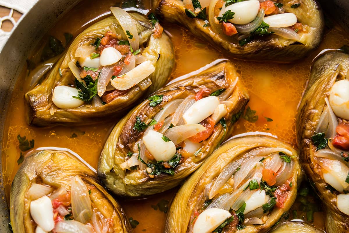 İmam bayıldı has been a very popular dish from the Ottoman era to our day. Its recipe is quite simple: cut the eggplant in half, scoop out the centre, and add a filling of your choice. It is quite common to add diced onion, garlic, and tomatoes.